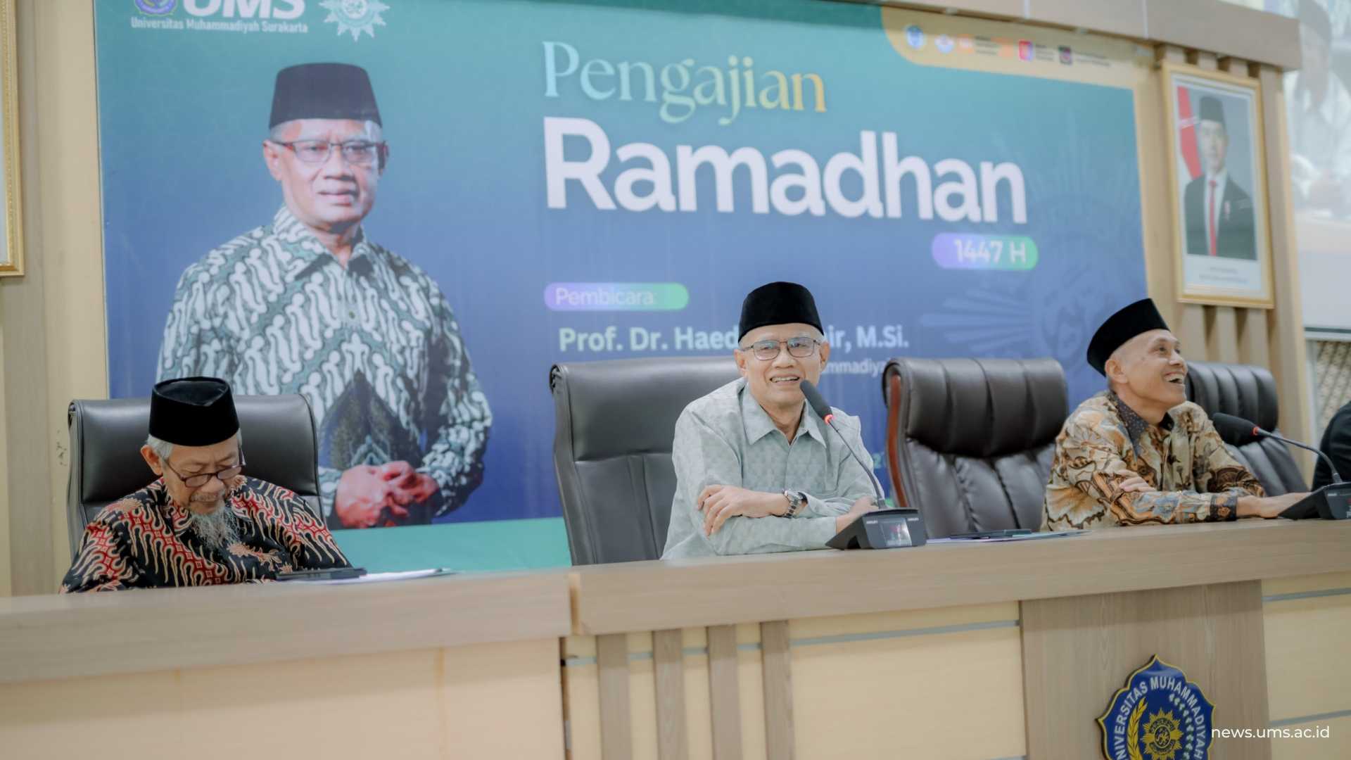 Sementara itu, tausyiah disampaikan oleh Ketua Umum Pimpinan Pusat Muhammadiyah Prof. Dr. H. Haedar Nashir, M.Si., ia mengawali ceramahnya dengan mengungkapkan rasa syukur karena masih dapat dipertemukan dalam suasana Ramadan melalui kegiatan pengajian yang rutin diselenggarakan oleh UMS.